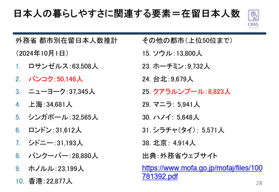 外務省の資料によると、バンコク居住の日本人は50,000人以上、クアラルンプール居住の日本人は9,000人弱です。